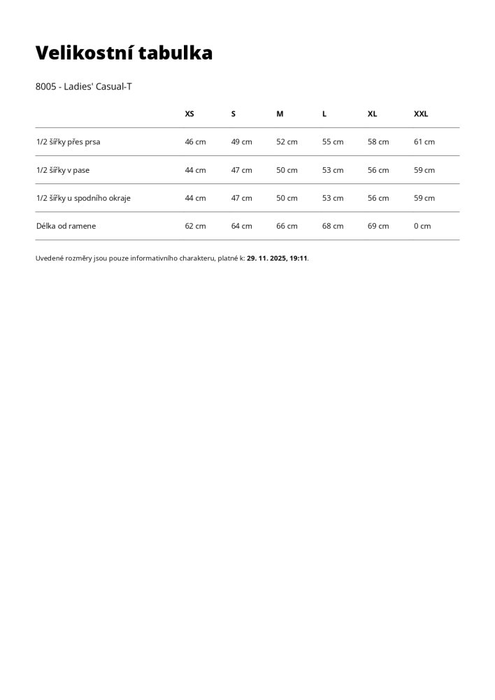 Tričko má dámský casual střih, který je lehce projmutý a lichotí postavě, aniž by omezoval pohyb. Klasický kulatý výstřih se zpevněným lemem dodává tvarovanou stálost i při častém praní. Hladký povrch látky je perfektní pro potisk či firemní branding, což z něj dělá skvělou volbu jak pro každodenní nošení, tak pro firmy nebo reklamní účely.
